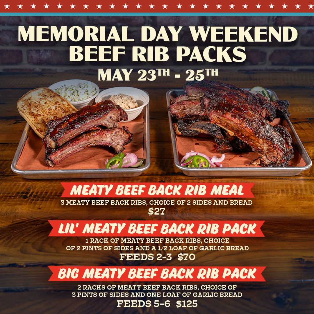 Memorial Day weekend calls for good ribs. We’re smoking up our meaty beef back ribs May 23rd–25th. They’re the kind that make the whole neighborhood smell good and leave you wanting more.